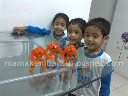 Si kembar 3 pun happy dapat mainan Ben 10 pojaan hati π
