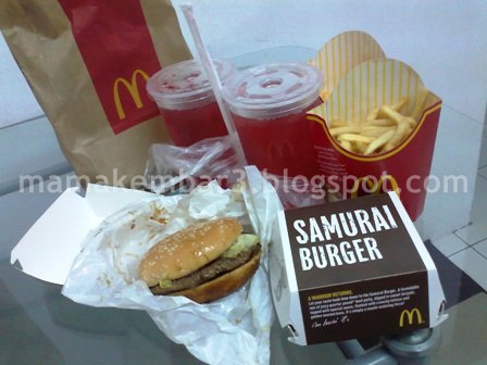 Mama & Ayah memang sangat suka Samurai Burger nih. In fact kitorang berdua lebih suka Samurai daripada Prosperity Burger. Tapi dah laaamaaa sangat tak ada, rasanya dekat 10 tahun gak kot McDonalds tak buat Samurai Burger nih. Slalu kitorang tertanya tanya, bila laa nak ada balik Samurai Burger nih. Baru a few months back Mama jokingly kata kat Ayah nak email McD lah suh buat balik Samurai nih, tapi aii tak email pun hehe.