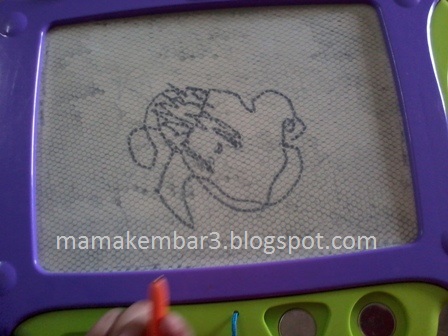1st time si Fauzi tunjuk pic tu kat Mama terus hati berbunga bunga “eh eh pandai jugak anak aku lukis” *sengih*. Pastu datang si Fahmi sibuk “mari, mari cini Fahmi lukis pulak”. Dia ambik & tambah mata tu, lagi laaa berbunga bunga hati mak sorang nih, happy sebab tak sangka Fahmi pun leh tangkap apa yang si Fauzi lukis. Means lukisan tu cukup ‘real’ & cantik laa kan, kan?