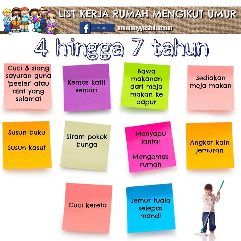 Mama terjumpa ni di Facebook dan nak kongsikan kat sini. Boleh jadi panduan untuk ibubapa dalam melatih anak anak untuk membantu menguruskan kerja rumah. Biarlah bermula dari kecil dengan tugasan yang mudah, tapi latihan tu penting agar anak anak ringan tulang dan rajin membantu bila dah besar nanti kan?